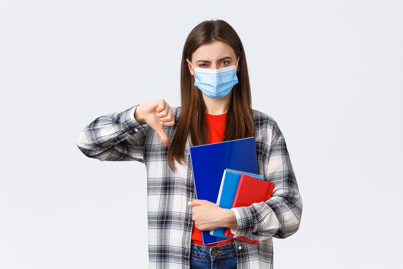 Coronavirus pandemic, covid-19 education, and back to school concept. Displeased and disappointed female student, freshman in medical mask thumb-down and grimacing discussing smth bad.