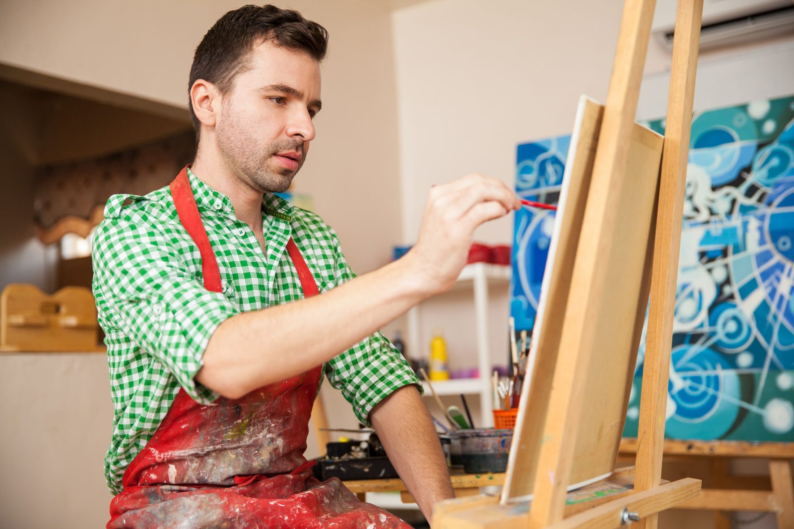 Handsome male artist wearing an apron and working on a painting in his studio