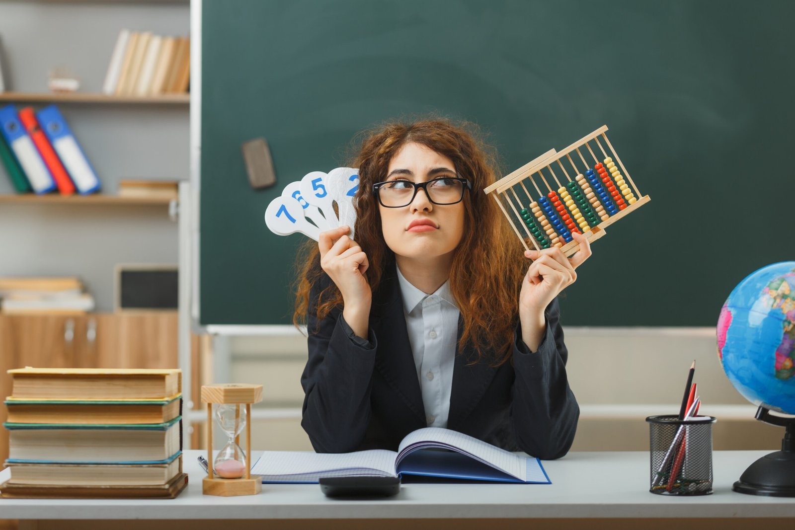 sad young female teacher wearing glasses holding abacus with number fan sitting at desk with school tools in classroom SSUCv3H4sIAAAAAAAACpyRy47DIAxF9yPNP0SsGynPJplfqWbhgJugEqiAdDSq+u/DI1SsZ4eP7Wtf8/z8KAoyg+GUfBVPH7mYC7Ebq8FyJR2uTgfXKBnqnDx0e65ygIxbpTmIHM5g6SphQwflLoTHr5AkxoLdDRo//UAULC5OI8K3RFzxEuMiJULSdbgUIaeMmX0OLKEo/q/O+PhObmBBSX/DwpkRjQIhGrnEUnL7sai33BrsjKvM1UNREL6gzZTumlMul6xN2TWcPbVRtUur/QrvzYlQ6g6z8Ce+Ok1MfAVjXDlLPBtE3SerLZsjlQ0GDlXC3E/4sG6b6dyNbd+1Uz31dTMcBfH3Vu50wjpJyMX0xllunfsNSNVX9YDAyqbBruzYMJRj19flDHQcpivrq7lyh3/9AQAA//8DAF36tsGYAgAA