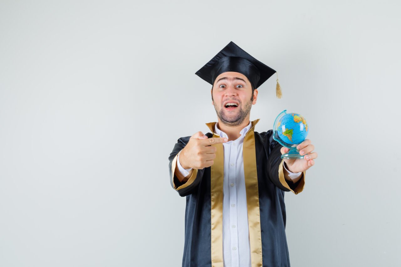 Young man pointing at school globe in graduate uniform and looking joyful. front view.